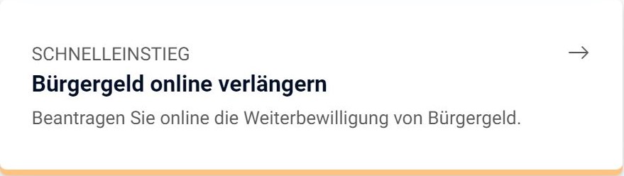 Ab Oktober 2024 erfolgt kein Versand von Formularen zur Weiterbewilligung Bürgergeld! Dies betrifft die Zeiträume ab Dezember 2024. Bitte stellen Sie ca. 6 Wochen vor Ablauf Ihres Bewilligungsabschnitts den Weiterbewilligungsantrag online auf jobcenter.digital. Das Ende Ihres Bewilligungsabschnitts entnehmen Sie bitte Ihrem Bewilligungsbescheid.